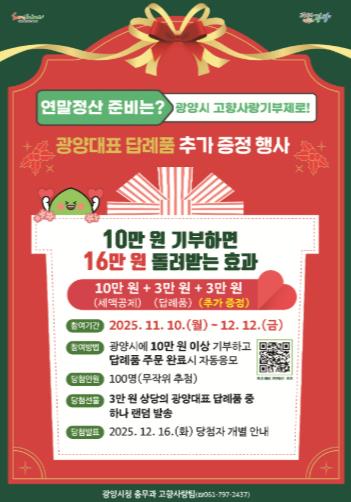 광양시에 10만 원 이상 기부하고 답례품 신청을 완료한 기부자 중 100명을 추첨 프로그램을 통한 무작위 방식으로 선정하며, 당첨 시 기본 세액공제 및 답례품 혜택 외 3만 원 상당의 광양 대표 답례품이 추가로 제공된다.