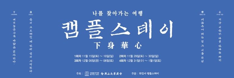 캠플스테이 진행은 2025년 11월 15일부터 12월 말까지 4회(회당 1박 2일) 진행 된다. 캠플스테이 회차는 1회차 11월 15일 – 16일, 2회차 11월 29일 – 30일, 3회차 12월 05일 - 06일 , 4회차 12월 31일 – 1/1일로 나누어 진행된다. 회차별 정원은 30명이다. 금번 캠플스테이 프로그램 하신화심(下身華心)은 MZ세대인 대학생과 청년세대(20~30대)로 연령 제한을 두었다. 참가비는 무료이다. 1~3회차는 사회 공익적 프로그램으로 진행되며, 청년들의 정신적 휴식과 자아성찰을 지원하기 위한 취지로 사전예약제로 진행된다. 그러나 4회차 참가 신청은 11월 24일부터 12월 5일까지 화엄사 공식 홈페이지 및 SNS에 참가 사연을 기재 후 접수 할 수 있다. 4회차 캠플스테이 참가 할 수 있는 참가자는 신청자 중 내부 심사를 통해 12월 12일 개별 통보 한다.