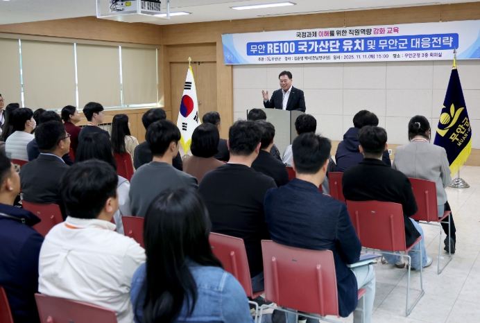 이번 교육은 오는 11월 11일 오후 3시, 무안군청 3층 회의실에서 진행됐으며, 전남발전연구원 김준영 박사를 초청해 ‘RE100 국가산단 유치 및 조성 전략’을 주제로 강연이 이뤄졌다.