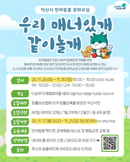 ![]() "매너있개 같이 놀개" 익산시, 반려동물 교육 |