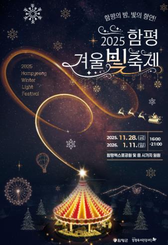‘2025 함평 겨울빛축제’는 ‘함평의 밤, 빛의 향연’을 주제로 오는 11월 28일부터 2026년 1월 11일까지 45일간 함평엑스포공원 일원에서 개최된다.