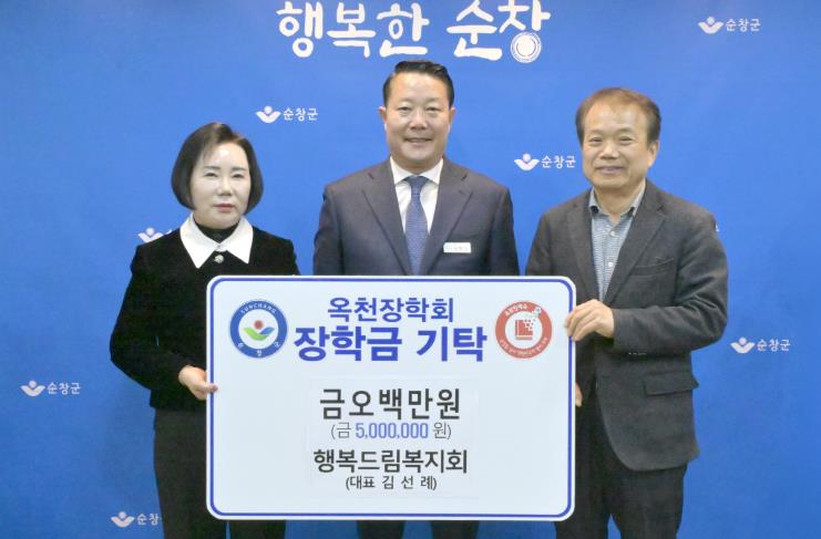![]() (사)행복드림복지회 김선례 대표, 순창군옥천장학회에 장학금 500만원 기탁 |
