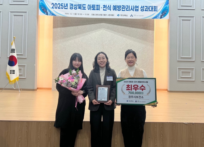 ![]() 2025년 경상북도 아토피‧천식 예방관리사업 성과대회에서 최우수상을 수상한 경주시보건소 관계자들이 기념촬영을 하고 있다 |