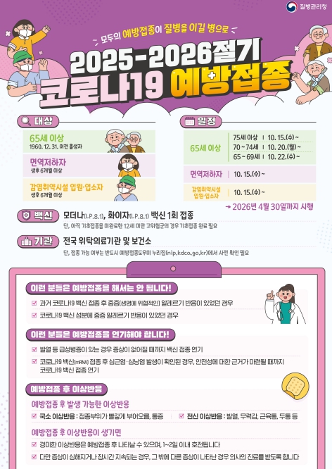 또한, 보육·어르신 시설에서는 집단발생 감시 및 감염 관리를 강화하고, 보건소는 어르신 코로나19·인플루엔자 동시접종 등 예방 접종률 제고 활동을 적극 추진할 계획이다.