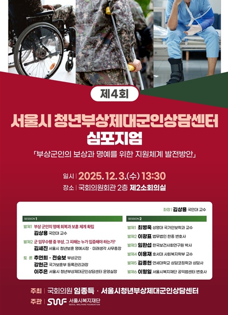서울시청년부상제대군인상담센터와 국회 임종득 의원실이 함께 주최하고 서울시복지재단이 주관한 심포지엄이 3일 국회의원회관에서 ‘부상군인의 보상과 명예를 위한 지원체계 발전 방안’을 주제로 열렸다. 행사에는 진수희 서울시복지재단 대표이사, 임종득 국회의원, 김재진 서울시 복지기획관, 청년부상군인과 그 가족들, 국가보훈부 관계자 등 80여 명이 참석했다.