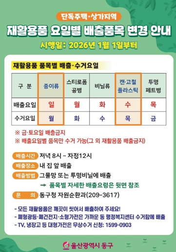 2026년 1월 1일부터는 월요일은 기타 재활용품에서 종이류로, 목요일은 기타 재활용품에서 플라스틱 및 캔·고철로 변경되며 나머지 화요일, 수요일, 금요일은 현행 품목을 그대로 유지할 예정이다.