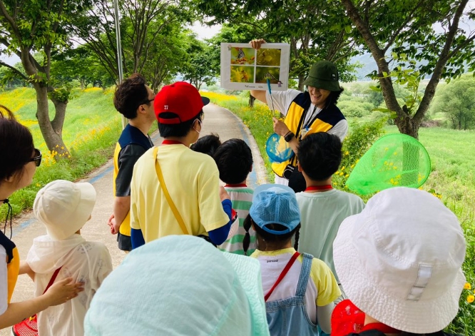 ![]() 학교 밖 마을교육의 일환으로 섬진강 생태습지를 견학하는 어린이들 |