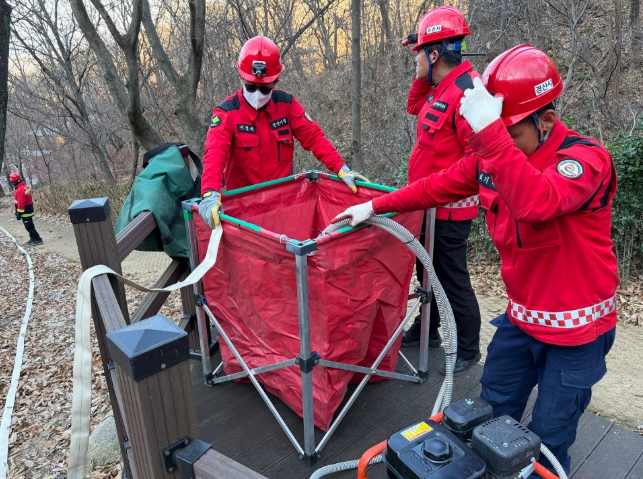 이번 훈련에는 경산시청 산림과와 산불전문예방진화대원 및 경산시 산불 진화헬기가 참여해 △산림 내 엔진 펌프를 이용한 장거리 송수라인 구축 △분기 호스를 활용한 동시 진화 체계 운영 △산불 확산 예상지점 드론 실시간 영상 전송 △헬기 물 투하 협조 체계 점검 등을 단계별로 수행했다.