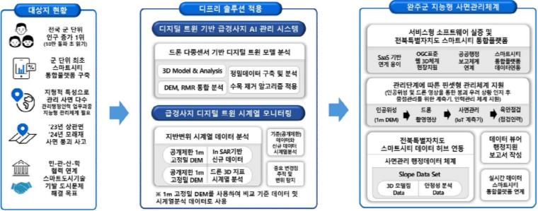 이에 완주군은 이러한 한계를 해결하고 보다 체계적인 관리 기반을 마련하기 위해 디지털트윈과 AI 기술을 결합한 스마트 재난관리 체계를 도입하기로 했다.