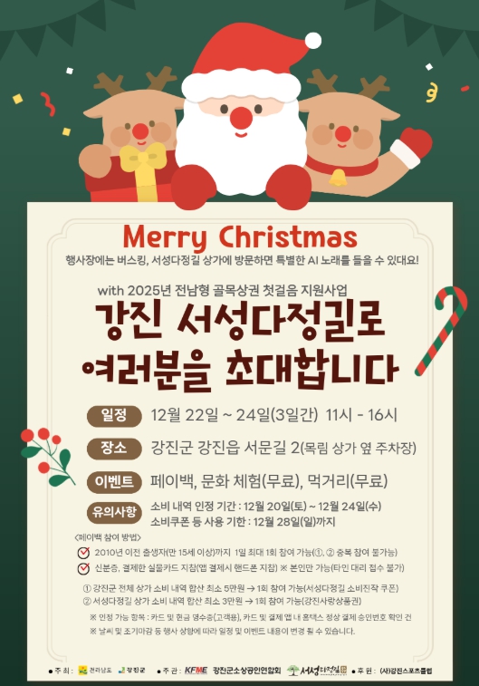 김혜정 강진군 축제마케팅추진단장은 “이번 크리스마스 행사는 지역 상권에 온기를 불어넣고, 군민과 방문객 모두가 함께 즐기는 연말 축제로 마련한 자리”라며 “골목상점가를 중심으로 다양한 행사를 지속 발굴해 지역경제를 활성화하겠다”고 말했다.