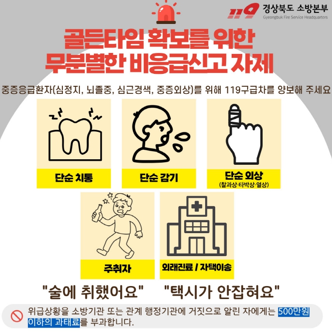 또한 경미한 질환, 단순 통증, 주취자 귀가 지원 등은 119구급출동 대상에 해당하지 않으며, 이러한 신고가 지속될 경우 중증 응급환자에게 배정되어야 할 구급차가 적시에 도착하지 못하는 문제가 발생할 수 있다고 밝혔다.