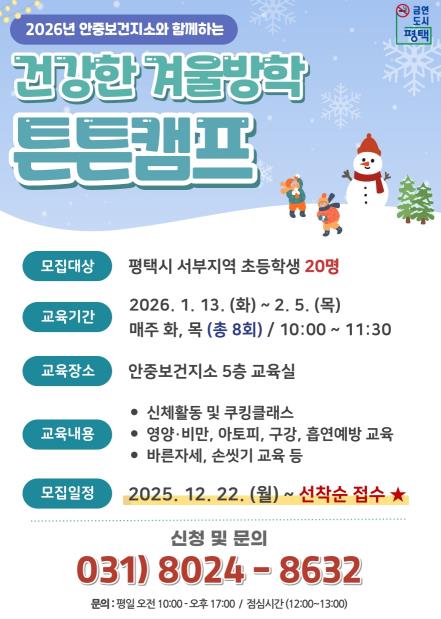 ![]() 평택시 안중보건지소, 2026년 초등학생 대상 '건강한 겨울방학 튼튼캠프' 참여자 모집 |