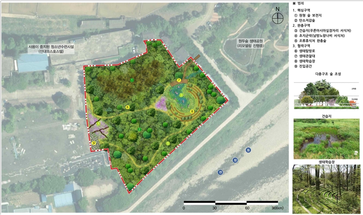 ![]() 경주시 산내면 외칠리 원두숲생태공원 인접부지 생태복원사업 기본계획도. 숲, 습지 복원과 생태탐방, 학습 공간을 조성해 생태 환경교육 거점으로 육성한다 |