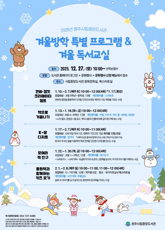이훈주 도서관장은 “겨울방학 특별 프로그램과 겨울 독서교실을 통해 아이들이 자기 주도적 독서 습관을 형성하고 문해력을 강화하길 바란다”라고 말했다.