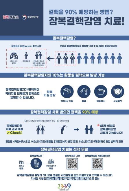 잠복결핵은 결핵균에 감염됐지만 증상이 나타나지 않은 상태를 의미하며 타인에게 전염되지는 않지만 면역력이 약해질 경우 활동성 결핵으로 발병할 수 있다. 그리고 잠복결핵은 결핵으로 발전할 수 있는 중요한 경로이므로 이를 예방하기 위한 초기 치료가 지역사회 내 결핵 예방과 확산 방지의 중요한 첫걸음이 된다.
