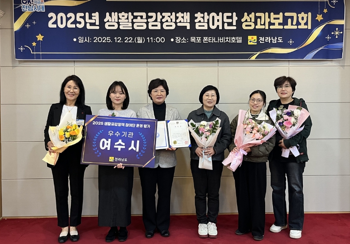 ![]() 지난 22일 목포 폰타나비치호텔에서 열린 ‘2025년 생활공감정책 참여단 성과보고회’에서 여수시가 전남도지사 기관 표창을 수상했다. |