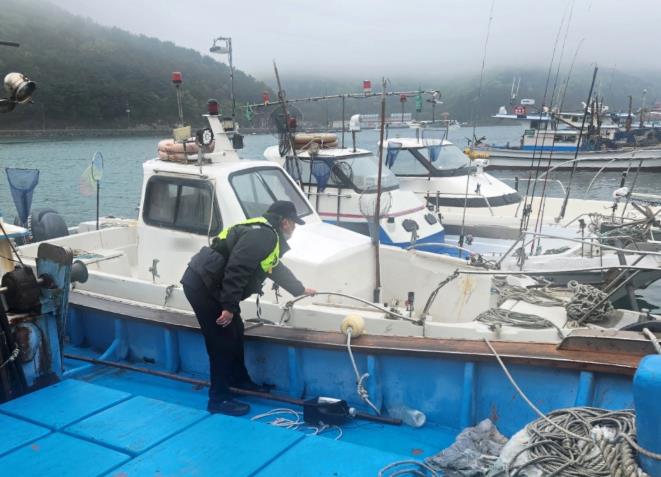 ![]() 사천해경, 연안 안전사고 위험예보제「관심」 발령에 따른 계류선박 점검 모습 |