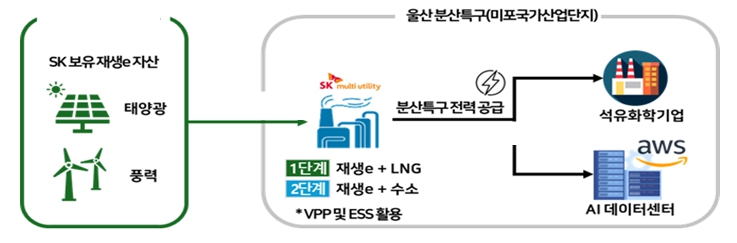 지역 발전사인 에스케이 엠유(SK MU)가 전력 직접거래를 통해 울산 미포국가산업단지 내 에스케이(SK)-아마존 데이터센터, 석유화학 기업 등에 저가 전력을 공급할 계획이다. 정부의 재생에너지 정책 기조에 맞춰 단계적으로 재생에너지와 친환경(그린)수소 기반의 무탄소 전력 공급도 확대할 방침이다.