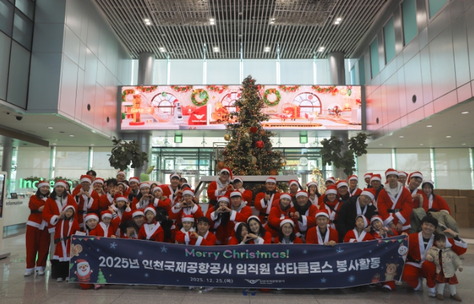 ![]() 25일 진행된 ‘2025 인천공항 임직원가족 산타클로스 봉사활동’에서 인천국제공항공사 임직원가족 산타클로스 봉사단이 기념촬영을 하고 있다. |