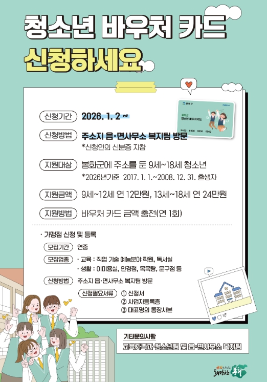 봉화군 청소년 바우처는 관내 주소지를 둔 9세~12세는 연12만원, 13세~18세는 연 24만원의 포인트를 지급하는 제도로 지역경제 활성화에도 기여할 것으로 기대된다.