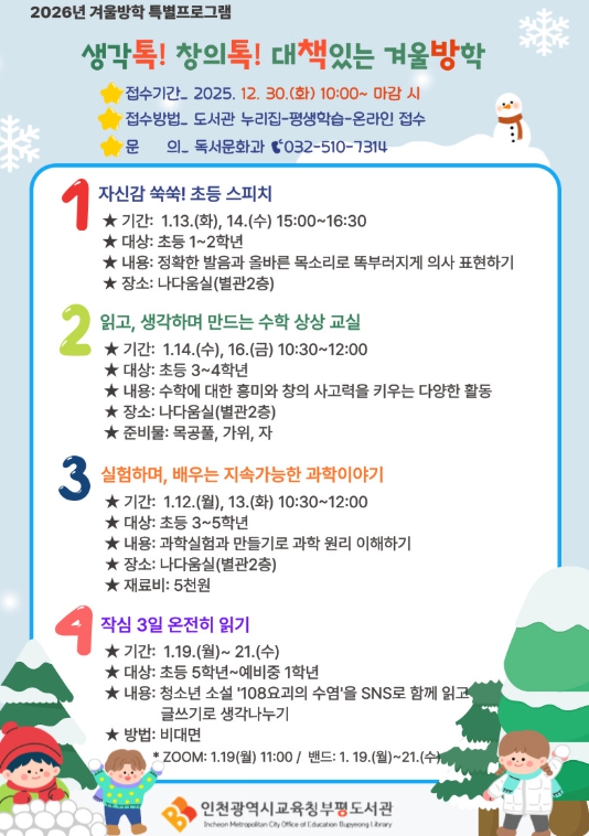 프로그램 신청은 12월 30일 오전 10시부터 부평도서관 누리집에서 가능하며, 교육은 부평도서관과 부광초등학교, 십정초등학교에서 진행된다.