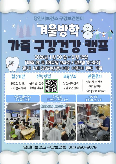 참여를 희망하는 가족은 1월 5일부터 마감 시까지 당진시 평생학습 통합 플랫폼 ‘배움나루’를 통해 온라인으로 접수하면 된다. 기타 자세한 사항은 당진시보건소 구강보건센터로 문의하면 된다.