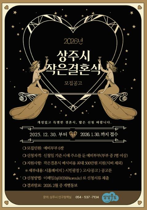 ![]() 2026년 상주시 작은결혼식 지원사업 신청자 모집 |