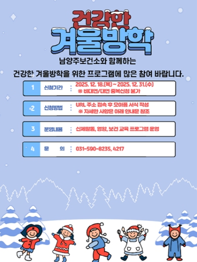 ![]() 남양주보건소, ‘초등학생이 건강한 겨울방학’ 프로그램 운영 |
