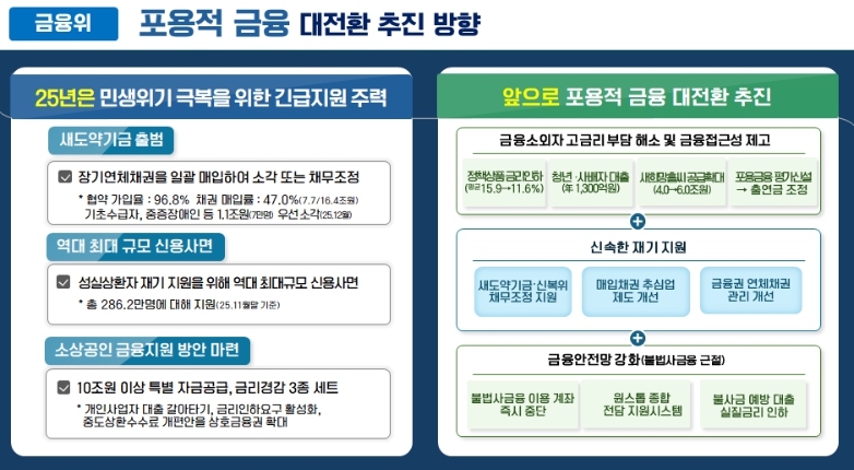 정부와 민간이 함께 서민자금공급을 확대해 나간다. 햇살론 등 정책서민금융상품은 1월부터 금리를 인하했으며, 청년·사회적 배려대상자를 위한 저금리 대출 상품 세부방안을 1분기중 발표할 계획이다. 민간부문의 포용금융 확산 유도를 위해 은행권 새희망홀씨 연간 공급규모 확대(2025년 4.0조원→2028년 6.0조원)와 함께 포용금융에 적극적인 역할을 한 은행은 객관적 평가를 통해 서민금융 출연금이 조정되는 구조를 마련한다.