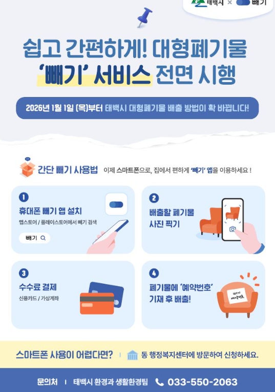 시는 지난해 10월 주식회사 ‘같다’와 업무협약을 체결하고 대형폐기물 배출 모바일 앱 ‘빼기’ 서비스 도입을 결정했으며, 2026년부터 태백시민은 스마트폰을 통해 대형폐기물 배출 전 과정을 보다 간편하게 처리할 수 있게 된다.