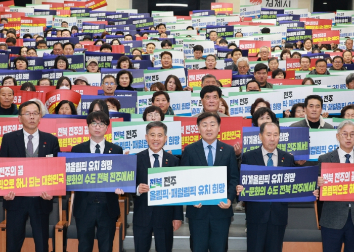 ![]() 9일 김제시청에서 열린 '도민과 함께하는 2026년 시군 방문'에 김관영 전북특별자치도지사와 정성주 김제시장 및 참석자들이 도민과의 대화 시간을 갖고 '하계올림픽 유치희망 K-문화의 수도 전북 전주에서' 피켓을 들고 기념촬영을 하고 있다 |