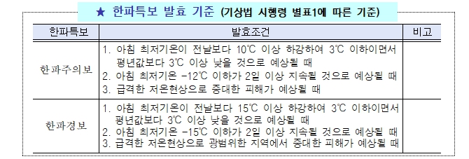 한파특보 중 ‘한파주의보’는 아침 최저기온이 전날보다 10℃ 이상 하강하여 3℃ 이하이면서 평년값보다 3℃ 이상 낮을 것으로 예상되거나 아침 최저기온이 전날보다 12℃ 이하인 날이 2일 이상 지속될 것으로 예상될 때 발효된다.