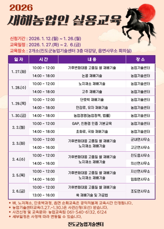 진도군은 ‘2026년도 새해 농업인 실용교육’을 오는 1월 27일부터 2월 6일까지 2주 동안 진도군농업기술센터 등에서 진행한다.