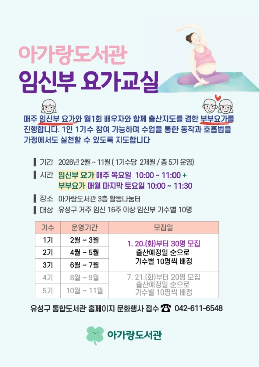 정용래 유성구청장은 “요가교실을 통해 임신부와 부부가 출산 과정을 함께 이해하고 준비하는 데 도움이 되길 바란다”라며 “앞으로도 임신·출산에 특화된 맞춤형 프로그램을 확대하겠다”라고 말했다.