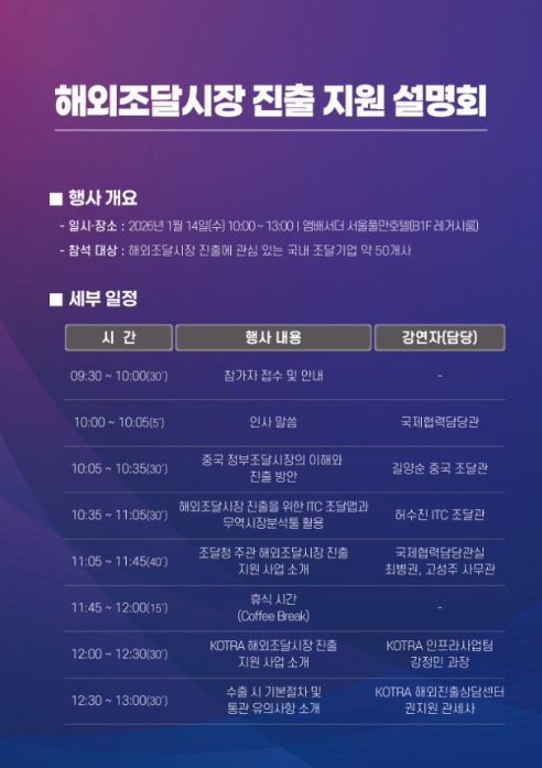![]() 2026년 해외조달시장 진출 지원 사업설명회 포스터 |