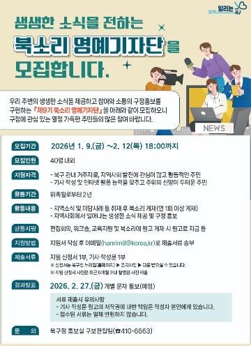문인 북구청장은 “북소리 명예기자단은 주민이 직접 지역의 변화와 일상을 전하는 메신저인 만큼 이번 모집에 많은 관심과 참여를 바란다”며 “앞으로도 북소리가 주민과 행정의 소통 창구 역할을 할 수 있도록 다양한 지원을 아끼지 않겠다”고 말했다.