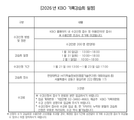 수강 신청은 1월 21일(수) 오후 1시부터 23일(금) 오후 5시까지 KBO 홈페이지 수강신청 접수 창을 통해 가능하며, 기타 문의사항은 KBO 홈페이지 내 기록위원회 스코어링 필드 1:1 문의하기를 이용하면 된다.