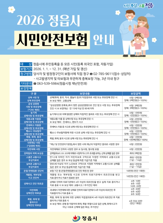 ![]() 정읍시, 시민안전보험 보장 25종으로 대폭 확대 |
