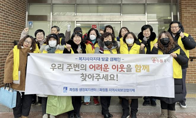 장인영 파장동장은 “이번 캠페인을 통해 지역 내 복지사각지대 대상자를 발굴하고 주민과 함께 복지 안전망를 강화하는 계기가 됐다”며 “앞으로도 현장 중심의 복지사각지대 발굴 활동을 지속적으로 추진하겠다”고 말했다.