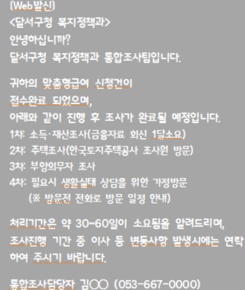 이에 달서구는 2024년부터 알림톡 서비스를 도입해, 구청 통합조사팀에서 신청 서류를 확인한 후 신청인에게 조사 담당자, 조사 기간 및 절차 등을 알림톡으로 안내하고 있다.