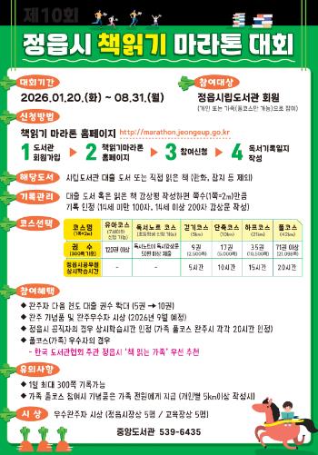 ![]() 정읍시립도서관, 독서 마라톤 개최… 완주하면 내년 대출 2배 |