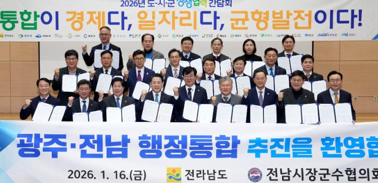 ![]() 광주·전남 행정통합 ‘도-시군 상생협력 간담회’ 사진-광주·전남 행정통합을 통해 지역 대도약을 실현하기 위한 ‘26년 도-시-군 상생협력 간담회’가 16일 도청 왕인실에서 열린 가운데 김영록 전라남도지사를 비롯한 시군 단체장들이 광주·전남 행정통합 결의문을 낭독하고 기념촬영을 하고 있다. |