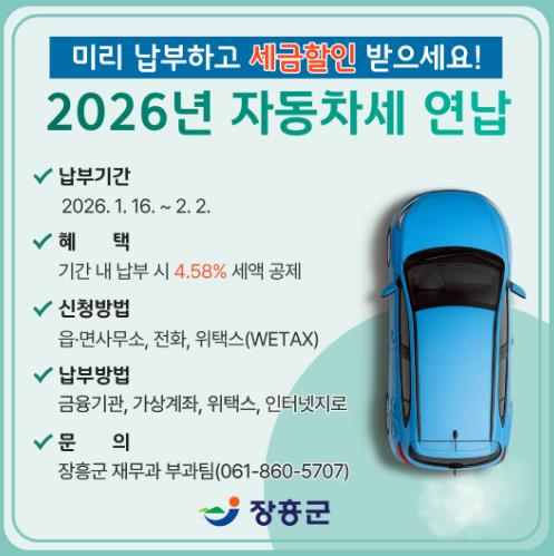 ![]() 장흥군 “2026년 자동차세 연납하고 공제받으세요” |
