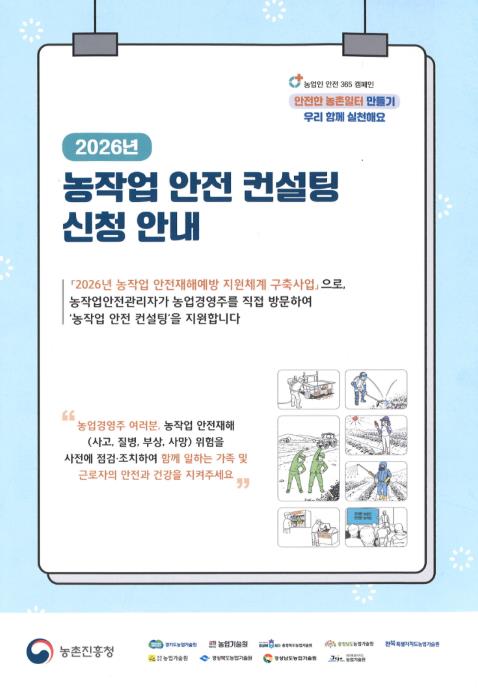 이번 사업은 농작업안전관리자가 농업경영주를 직접 방문해, 농작업 현장의 위험요인을 진단하고 농가 여건에 맞는 맞춤형 안전관리 컨설팅을 제공하는 사업이다. 2월까지 상시 모집을 통해 총 110농가를 선정할 계획이며, 컨설팅은 3월부터 11월까지 진행된다. 참여 비용은 전액 무료로 지원된다.