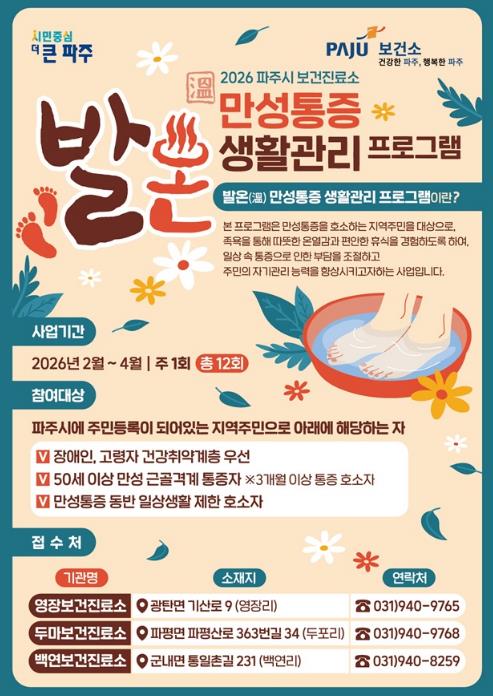![]() 파주시 보건진료소 특화사업, ‘발온(溫) 만성통증 생활관리’ 교실 운영 |