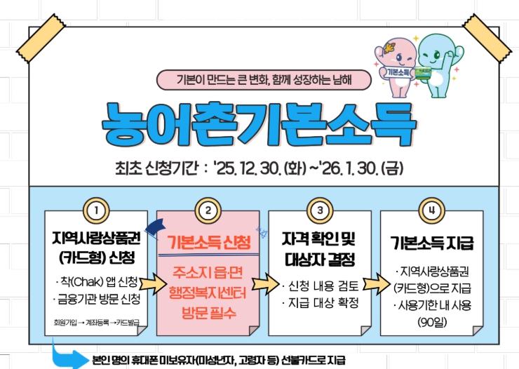 남해군 관계자는 “농어촌 기본소득은 읍·면 행정복지센터 방문 신청이 원칙”이라며 “신청 기간 내 반드시 직접 방문해 신청 절차를 완료해야 최초 지급분을 받을 수 있다”고 말했다.