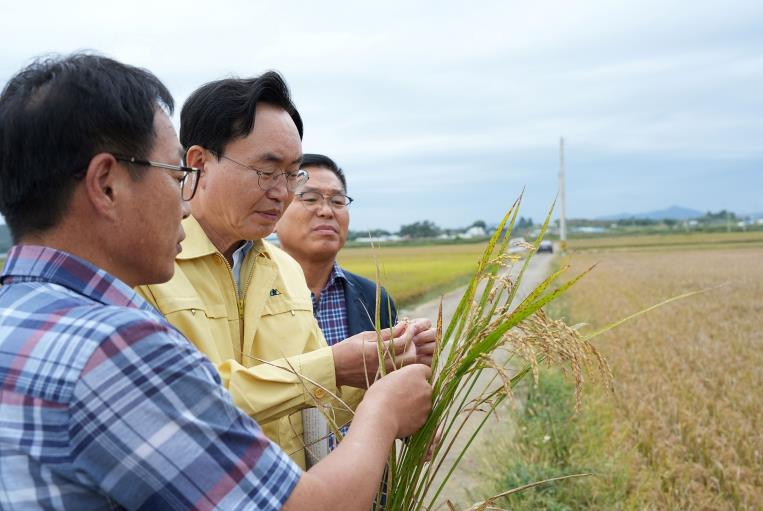 ![]() 나주시가 벼 깨씨무늬병 피해를 본 농가에 복구비를 지원한다. 사진은 윤병태 시장(가운데)이 벼 깨씨무늬병 상태를 살피고 있는 모습. |