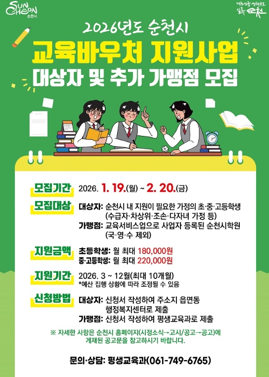 시 관계자는 “순천시 교육바우처 지원 사업으로 가정형편이 어려운 학생들이 교육비 걱정을 덜고 배움의 기회를 넓히는 데 도움이 되기를 바란다”며, “앞으로도 누구나 공평하게 교육받을 수 있는 순천시를 만드는 데 최선을 다하겠다”고 전했다.