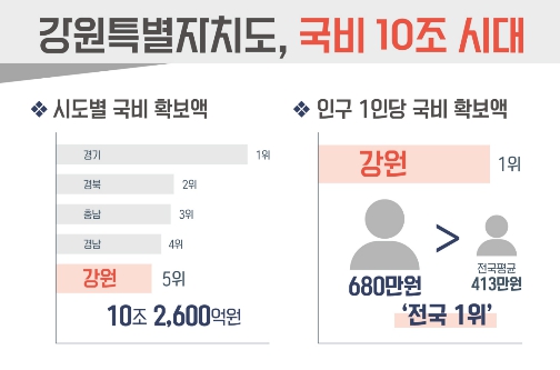 2026년도 강원특별자치도 국비 확보액은 총 10조 2,600억 원으로 경기, 경북, 충남, 경남에 이어 전국 시도 중 5위에 해당한다.