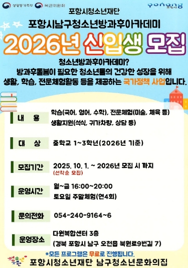 ![]() 포항시 남구 청소년방과후아카데미, 2026년 신입생 모집 포스터. |